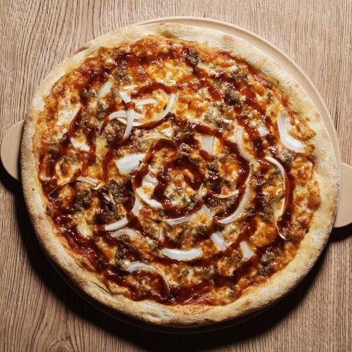 Tomatensauce, Mozzarella, Rindfleisch, Zwiebeln, BBQ-Sauce.