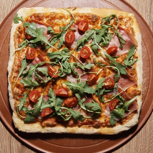 Tomatensauce, Mozzarella, frische Tomaten, Rohschinken, Rucola