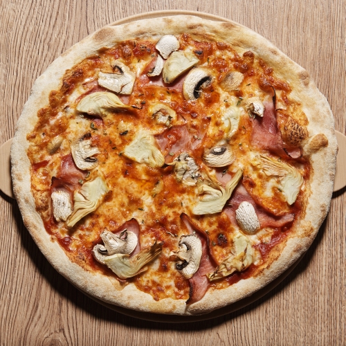 Tomatensauce, Schinken, Champignons, Artischocken.