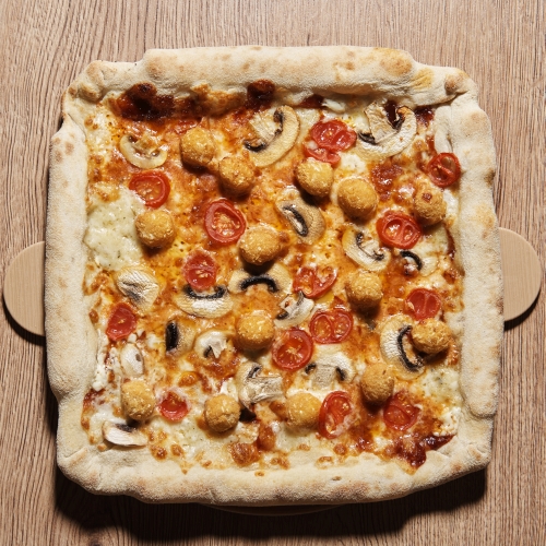 BBQ-Crèmesauce, Mozzarella, zartes Pouletfleisch, Cherrytomaten, Champignons. (28x28cm)