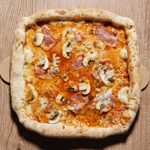 Tomatensauce, Mozzarella, Speck, Champignons, Gorgonzola. (28x28cm)