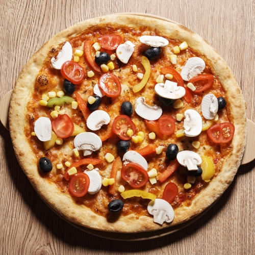 Tomatensauce, Mozzarella, schwarze Oliven, Peperoni, Mais, Champignons und frische Tomaten.